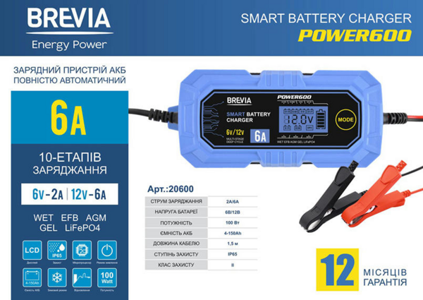 Зарядное устройство для АКБ Brevia Power600 6V/12V 6A (20600EP) – это надежный помощник, который поможет вам всегда поддерживать ваш аккумулятор в рабочем состоянии.