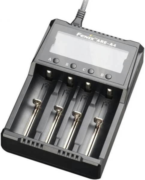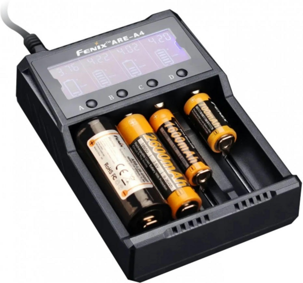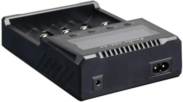 Модель Fenix ARE-A4 подойдет как для зарядки аккумуляторов дома, так и для путешествий. Это компактное устройство, которое в состоянии работать от обычной электросети с напряжением 220В и от аккумулятора, установленного в автомобиле. Кабель для подключения к электросети есть в комплекте. Но главное преимущество этой модели заключается в ее универсальности в отношении форматов аккумуляторов. Fenix ARE-A4 одинаково хорошо работает с никель-металлгидридными, литий-ионными и никель-кадмиевыми элементами питания. Совместимыми с этим зарядным устройством являются 9 разновидностей аккумуляторов: АА, 14500, ААА, 10440, С, 26650, 18650, 21700, 16340. Зарядное устройство работает при температуре окружающей среды от 20 градусов мороза, до 50 градусов жары. Температура во время его хранения может быть еще выше и достигать 80 градусов Цельсия. Такой же широкий диапазон допустимых параметров влажности: от 5% до 90%. Кроме того, производители снабдили данную модель защитой от перегревания аккумуляторов, от переполюсовки и коротких замыканий. Кроме того, сразу же по завершении процесса зарядки, устройство отключает соответствующий слот, чтобы аккумулятор не подвергался перезарядке. Пользователю доступна вся важная информация о состоянии аккумуляторов и их характеристики. На встроенный дисплей выводятся данные о типе элемента питания, его напряжении, текущем уровне заряда и ожидаемом времени окончания зарядки, а также о силе тока. Каждый слот устройства управляется отдельно, а все данные пользователь может переключать, нажимая на кнопку выбранного слота. Экран можно отключить, если подержать кнопку нажатой чуть дольше обычного.