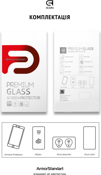 Защитное стекло ArmorStandart Icon Series имеет аутентичные габариты и толщину в 0,3 мм. В комплект входит все необходимое для быстрой и комфортной установки.