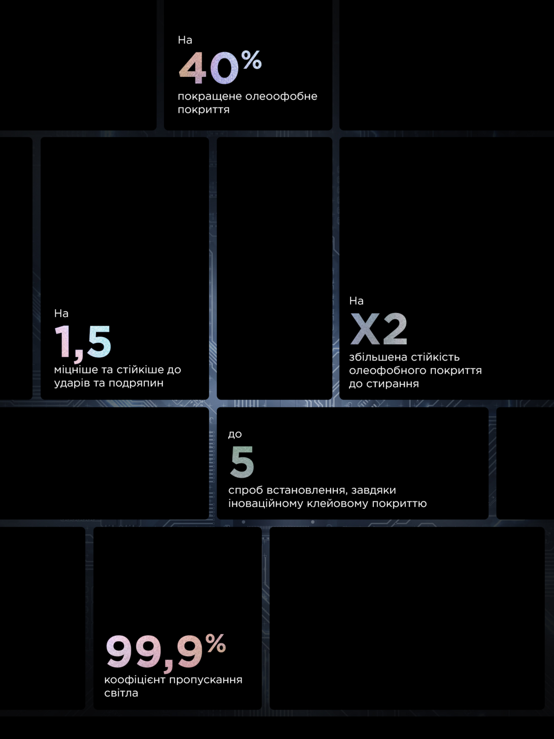 | Особенности | Защита от жира, Защита от потертостей, Защита от царапин, Олеофобное покрытие |