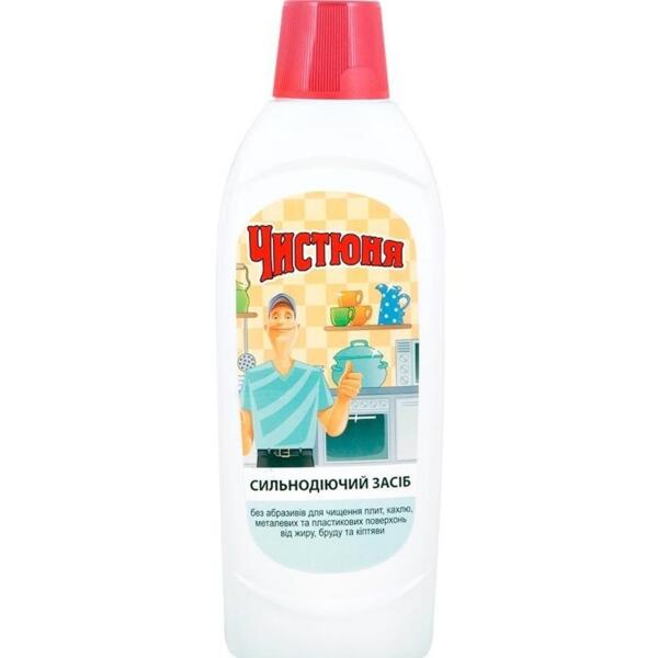 Без абразивов для очищения плит, кафеля, металлических и пластиковых поверхностей от жира, грязи и копоти «Чистюня» быстро и эффективно чистит кухонные плиты, кафель, металлическую посуду, стеклянные, пластиковые поверхности от пищевых пятен, грязи, жира и копоти. Средство не содержит абразивов! Способ применения: нанесите небольшое количество средства на загрязненную поверхность, оставьте на 5-10 минут, после чего повторите процедуру. Меры предосторожности: Внимание! Не обрабатывайте поверхности из алюминия, меди и их сплавов, а также поверхности с нестойким покрытием. Не допускайте контакта с кожей и одеждой, используйте в хорошо проветриваемых помещениях, работайте в резиновых перчатках! При попадании в глаза немедленно промойте большим количеством воды и обратитесь за консультацией к врачу. Храните отдельно от пищевых продуктов, в недоступном для детей и домашних животных месте.