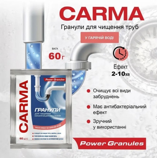 Carma — эффективное гранулированное средство для быстрого очищения канализационных труб от засоров. Активная формула быстро растворяет жир, остатки пищи, волосы и другие органические загрязнения, которые чаще всего вызывают засоры в раковинах, ваннах и душевых. Средство обеспечивает максимальный эффект при использовании с горячей или тёплой водой. Гранулы быстро активируются в воде и проникают в место засора, расщепляя отложения даже в труднодоступных участках труб. Средство также помогает устранить неприятные запахи и уменьшает количество бактерий в канализационной системе.
