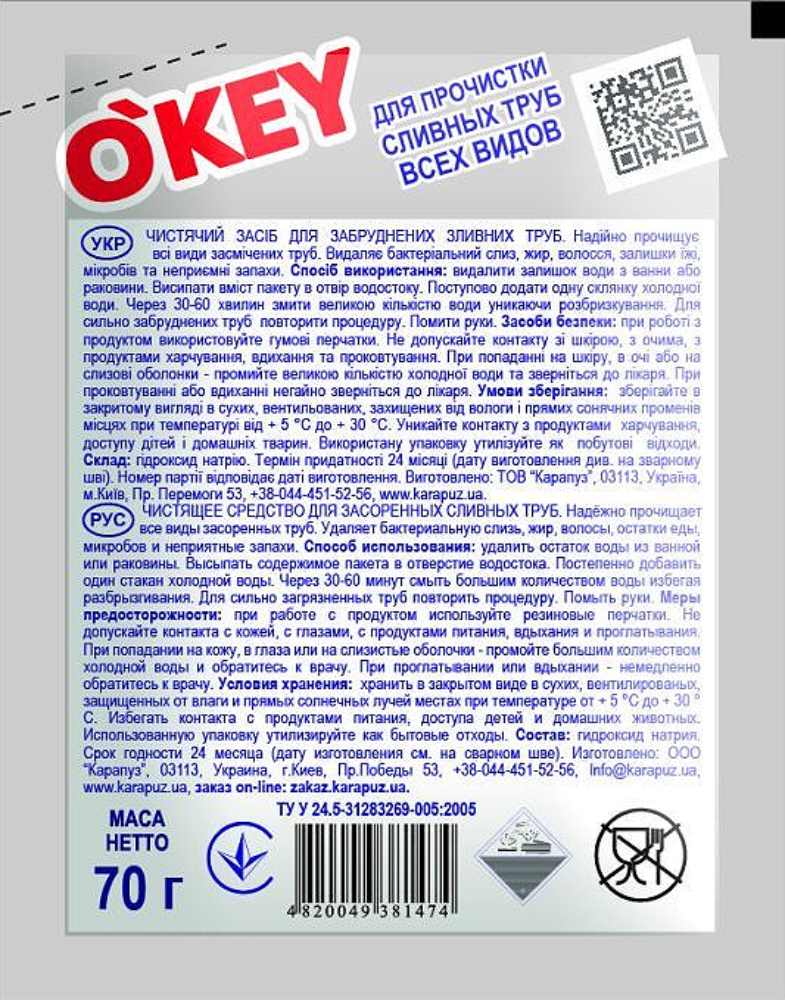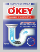Средство O'KEY для растворения загрязнений в канализационных трубах. Оно быстро очищает все типы засорённых труб, удаляет бактериальный налёт, жир, волосы, остатки пищи, микробы и неприятный запах.