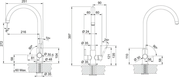Кухонный смеситель с поворотным невытяжным изливом и боковым рычагом управления в комплекте с фильтром для воды. Угол поворота излива составляет 360°, поэтому водяной поток достигает большей площади мойки, а также такой смеситель можно монтировать в островные кухни. Оба рычага откидываются на угол до 90° вперед, поэтому смеситель можно монтировать вплотную к стене.