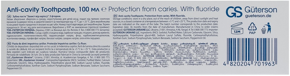| Состав | Sorbitol, purified water, calcium carbonate, glycerin, silica, hydroxyapatite, polyethylene glycol-400, sodium lauryl sulfate, fluoride, carboxymethylcellulose, xanthan gum, sodium pyrophosphate, sodium benzoate, sodium saccharin, peppermint oil |