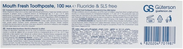 | Состав | Sorbitol, silicon dioxide, purified water, sodium cocoyl glutamate, xylitol, cellulose gum, sodium benzoate, sodium saccharin, ascorbic acid, menthol, aloe vera extract, eucalyptus, globulus leaf oil, eugenia caryophyllus flower oil, cinnamomum cassia bark extract, peppermint oil |