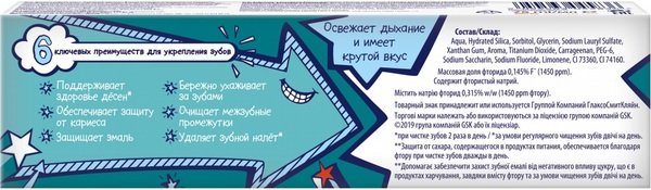 - укрепляет зубную эмаль благодаря содержанию фтора (1450 ppm);