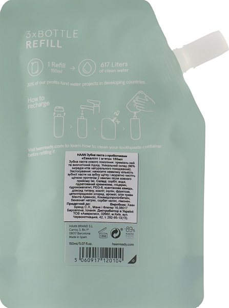 Освежающая зубная паста с фтором Haan Good on Ya является чистой и природной альтернативой, чтобы ваша улыбка оставалась здоровой, как никогда! Аромат пасты - это свежая и успокаивающая комбинация, навеянная австралийскими полями. Паста на 97% состоит из натуральных ингредиентов. Ее мощная формула с пребиотиком, инулином и кальцием помогает поддерживать хорошие бактерии на ваших зубах, действуя как суперпродукт для ваших десен. Защищает от вредных бактерий, отбеливает и добавляет свежесть. Реминерализирует зубы, одновременно предотвращая развитие кариес. Запасной блок для вашей любимой зубной пасты. Станьте частью изменений, приобретя экологически чистый вариант, который продлит срок службы вашей зубной пасты Haan. С помощью этого пакета вы можете наполнять тубу 3 раза. Пакет сделан на 97% из натуральных ингредиентов.