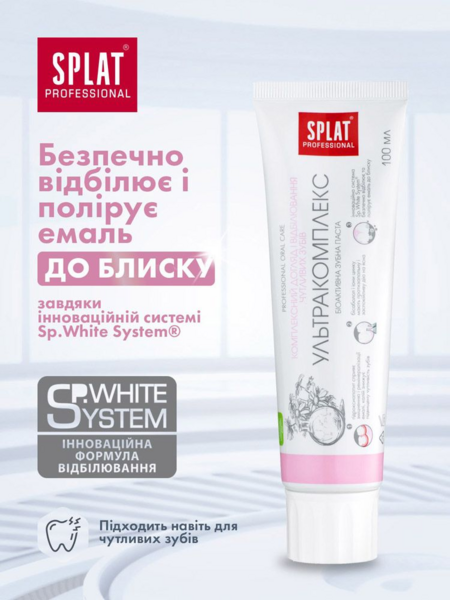 - Инновационная система Sp.White system безопасно отбеливает и полирует эмаль до блеска.