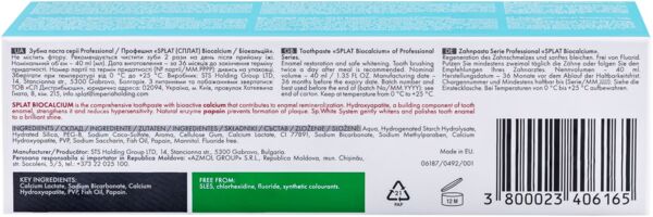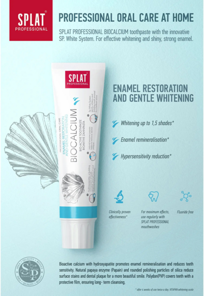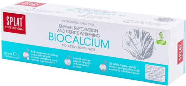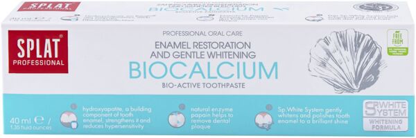 Компания Splat, специализирующаяся на разработке высокоэффективных средств для профессионального ухода за зубами и деснами, представляет одну из самых продаваемых паст в линейке Professional — "Биокальций". Это средство — ваш лучший помощник в борьбе за регенерацию зубной эмали и снижение чувствительности. Она насыщает природным кальцием поврежденные зоны на начальных стадиях кариеса. Частицы гидроксиапатита – основного строительного вещества твердых тканей зуба – действуют идентично пломбе, «замуровывая» микротрещины на поверхности эмали. Биоактивный компонент, который изготавливается из яичной скорлупы, и жирные кислоты — поставщики необходимого витамина D3 — значительно улучшают процесс усвоения минералов, в том числе кальция. При регулярном использовании пасты "Биокальций" уже через четыре недели вы заметите, как ваши зубы становятся более белыми и гораздо менее чувствительными, дыхание — более свежим, а налет исчезает. Средство не содержит фтора и вполне безопасно для ежедневного использования.